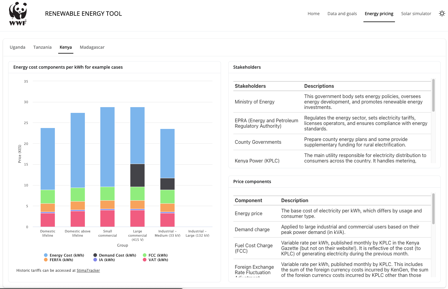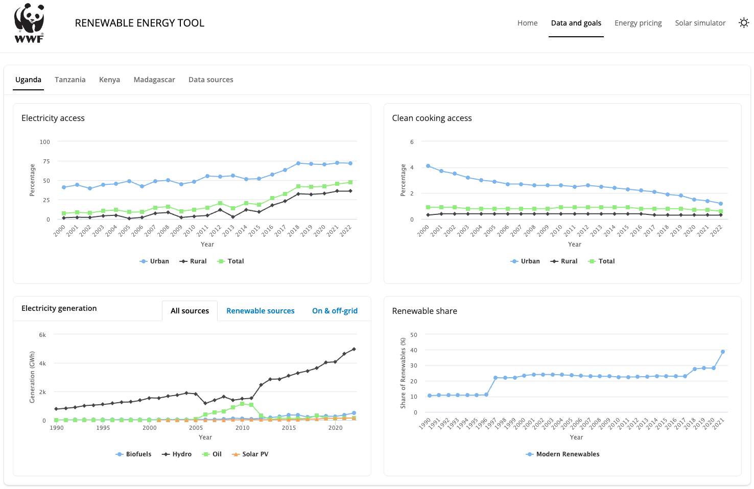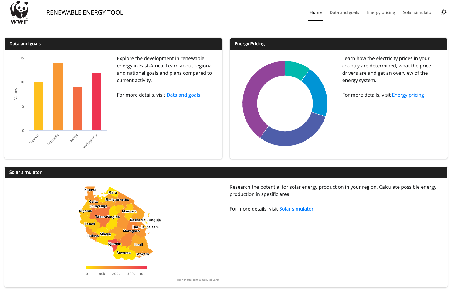 Som frivillig i Ingeniører uten grenser har jeg, sammen med tre kollegaer, bidratt til WWFs «East Africa Energy Transition Programme». Min rolle har vært å utvikle en nettbasert løsning med solkalkulator, oversikt over elektrisitetstilgang, ren matlagingstilgang, kraftproduksjon og fornybarandel. Løsningen viser også aktører i energisektoren og kostnadskomponenter for strøm i Uganda, Kenya, Tanzania og Madagaskar.